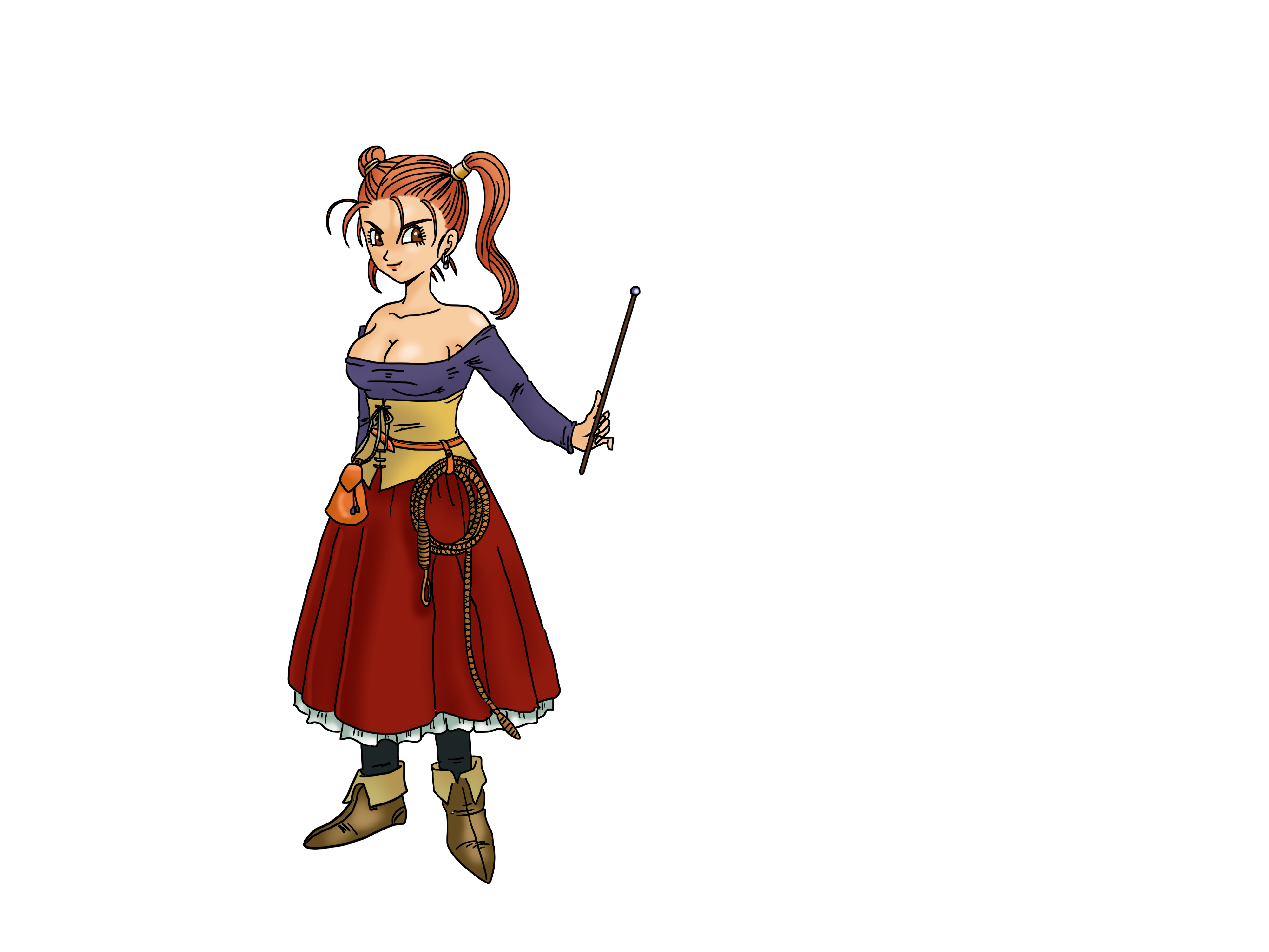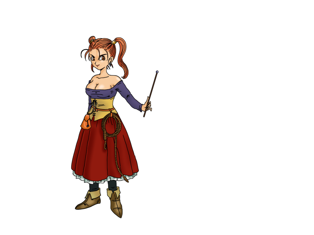 『ドラゴンクエストVIII 空と海と大地と呪われし姫君(2004)』に登場するゼシカは、赤みがかった髪を高い位置で二つ結びにしたツインテールが特徴的である。衣装は肩を大きく露出させた紫色のトップスと、コルセット風の黄色い帯を組み合わせ、赤いスカートとブーツを合わせている。腰にはポーチやロープを下げ、実用性を兼ね備えつつも華やかさを演出。手には細い杖を持ち、魔法職としての役割を強調している。全体像は「魔導士軽装型」に分類でき、同作のゲルダが盗賊的かつ野性的な装いであるのに対し、ゼシカは魔法使いとしての象徴性を際立たせている。