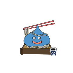 『ドラゴンクエスト』シリーズに登場する長寿そばスライムは、青色の球状スライムを基盤とし、全体にそばの麺が巻きついた外見をしている。頭頂部には赤い箸が差し込まれており、麺が持ち上げられる形で強調されている。下部には木製のそば箱と湯呑みが添えられ、#飲食文化装飾 と #食品融合型 の特徴を備えている。他の食品モチーフスライムと同系列であり、特に日本食文化を象徴する派生である。