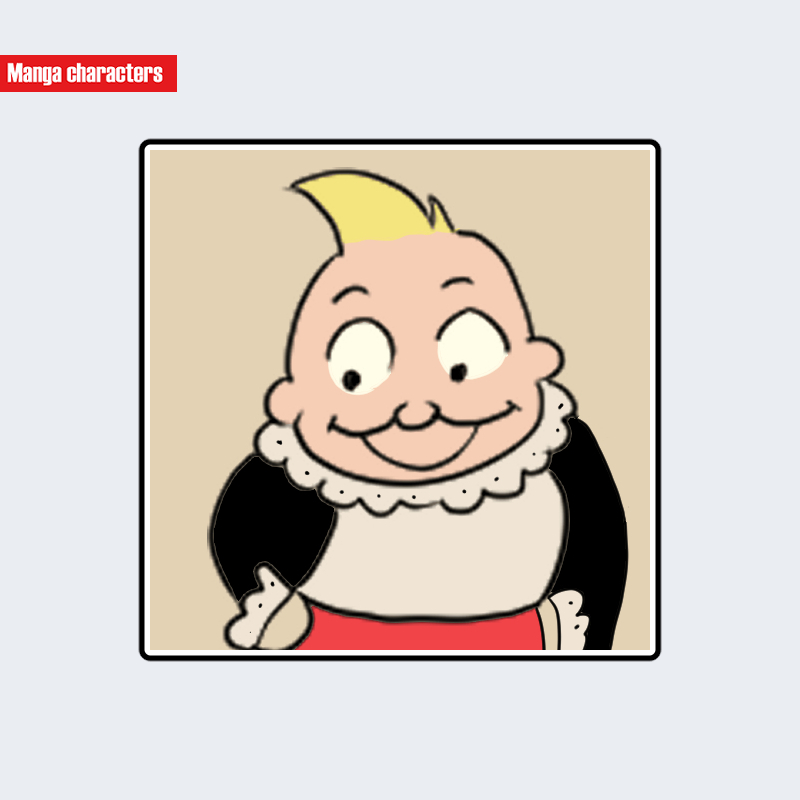 “comic child character” とすると一般的な子ども像と混同されるため、“stylized gag-strip figure” と補足する方が構造的に正確である。フリル襟は “ruffled collar” と記述し、誇張された丸みは “rounded exaggerated facial contour” と示すと誤訳を避けられる。髪の小さな房は “small forward hair tuft” と表すと形状が明確になる。