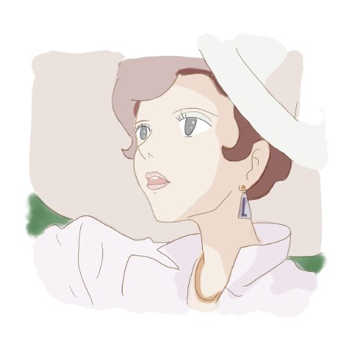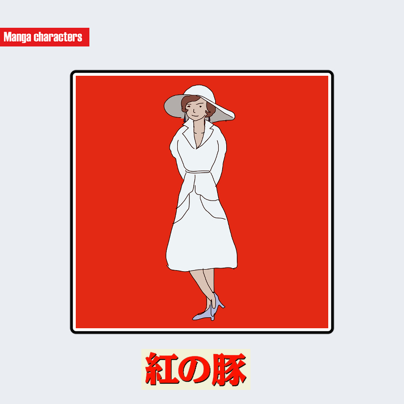 『紅の豚』に登場するマダム・ジーナは、広いツバをもつ白色の帽子と、長く流れるブラウン系の髪が特徴である。衣装は白を基調としたロングコート風のワンピースで、前面には大きめの襟と縦のラインを強調するシルエットが確認できる。袖は手首までの長さで、足元には淡い青色のヒールを合わせている。全体として「コート基層型」かつ「エレガンス衣装構造」に分類され、同作の実用衣装型(ピッコロ家の作業着系)とは衣装階層が明確に異なる。