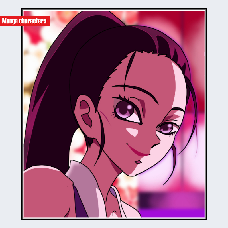 『鬼滅の刃』に登場する「雛鶴(ひなつる)」は、紫がかった黒髪を高く束ね、後頭部から長く流れる髪型が特徴の人物型キャラクターである。前髪は斜めに流れる細い束が頬へかかる造形で、髪全体は滑らかな曲線構造を持つ。瞳は赤紫系で大きく、黒い縁取りと強いハイライトによって視覚階層が明瞭に形成されている。肌色は淡く、陰影が抑えられているため、目元と髪型が主要な視覚要素となる。衣装は淡色の和装系で、襟の層構造が直線的に整えられている。