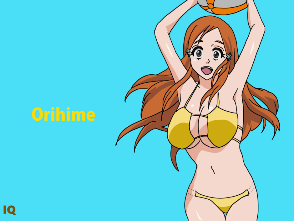 『BLEACH』に登場する井上織姫は、明るい橙色のロングヘアを持つ女性キャラクターである。画像では黄色のビキニを着用しており、上半身の露出構造が明確な「水着型」デザインで構成されている。髪は前髪を左右に分け、自然なウェーブがかかる形状で、柔らかいラインを強調する構図になっている。装飾要素は少なく、全体として人間的なボディラインを際立たせる造形であり、同作品内の死神衣装構造とは明確に異なる日常的スタイルを示す。