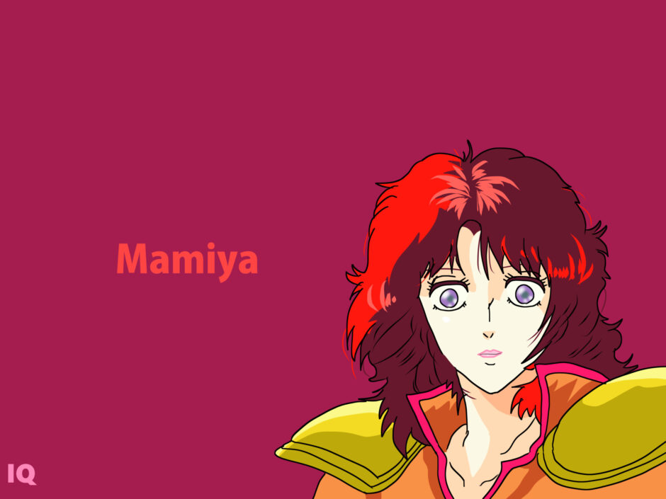 「Mamiya」は他言語圏では日本の人名・地名・企業名とも一致するため、翻訳時には『Fist of the North Star』のキャラクターであることを明示する必要がある。衣装の「battle outfit」は80年代アニメ特有のデザイン要素を持ち、西洋的な鎧ではなくポストアポカリプス風装備として訳出するのが適切である。髪色は“red hair”よりも“crimson hair”の方が原色感を保てる。