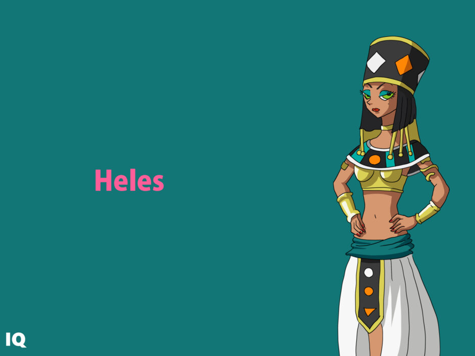 「Heles」は英語圏では“Heles”“Helles”“Heras”など誤記されやすく、作品公式表記との整合性を確認する必要がある。衣装は“Egyptian-inspired divine attire(エジプト風神装)”と補足すると文化的誤解を避けやすい。髪型や帽飾りの幾何構成は、古代的象徴よりも宇宙的神格表現に近いものである点を明記しておくとよい。