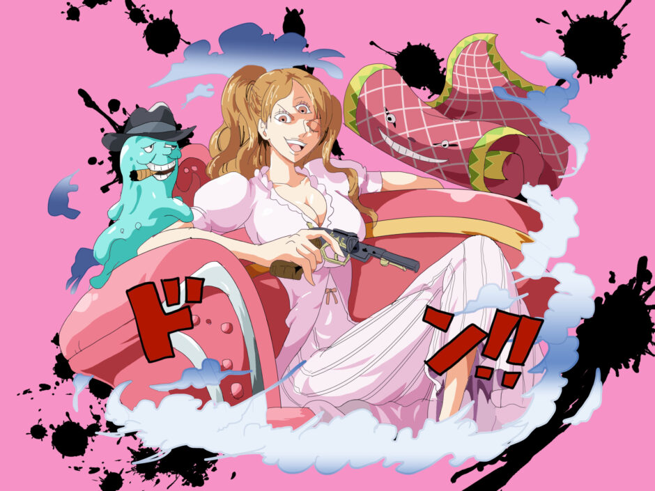 『ONE PIECE』に登場するシャーロット・プリンは、明るい茶色の髪を高い位置で束ねたツインテールが特徴の女性キャラクターである。髪は緩やかなカールが施され、全体に柔らかい印象を与える構造を持つ。衣装は淡いピンクを基調としたドレス風の構成で、「洋装融合型」に分類される。袖元から胸元にかけて軽いフリル装飾があり、腰部のリボンがデザインの中心線を形成している。全体の造形は軽やかで、配色の明度差によって上半身が際立つバランス設計となっている。