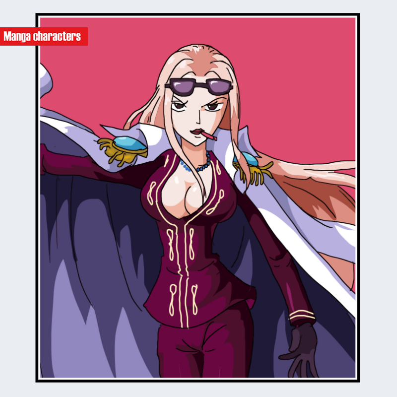 『ONE PIECE』に登場するヒナは、薄紫色の長髪を持つ女性キャラクターである。髪は前髪を中央で分け、左右に流れる整髪構造をしており、全体として直線的で上品なシルエットを形成している。衣装は濃い赤紫色のタイトなスーツに白い海軍コートを羽織った「軍服融合型」に分類される。胸元には開襟が施され、肩章や金ボタンの装飾が上下の視線を繋ぐ構造的役割を持つ。首元にかけてサングラスをかける点も特徴的で、軍服デザインの中に個性を際立たせている。
