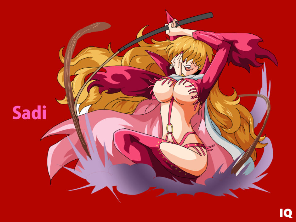 「Sadi-chan」は日本語の愛称表現を含むため、翻訳時には“Miss Sadi”または“Sadi (nickname form)”と補足するのが望ましい。衣装の「bodysuit」は単なる戦闘服ではなく、意図的な拘束・演出性を持つデザイン要素を含むため、“restrained costume design”として補足が適切。髪色の「blonde hair」は“golden blonde”とすることで艶感を保てる。