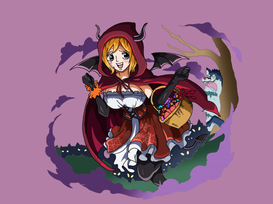 『ONE PIECE』に登場するコアラは、橙色の短髪と明るい印象の衣装を持つ女性キャラクターである。画像では赤いずきんと黒い翼の装飾を備えたハロウィン風コスチュームを着用しており、「仮装融合型」に分類される。衣装は赤と白を基調に、黒のタイツとブーツを組み合わせた構成で、肩や袖のフリルが全体の装飾バランスを整えている。腰には籠を提げ、装飾的な小物が視覚的重心を形成している。背景とのコントラストにより、赤色がキャラクターの中心視点を強調している。