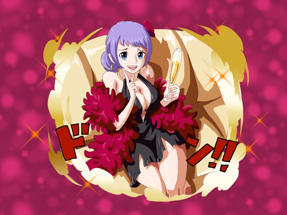 『ONE PIECE』に登場するカリーナは、淡い紫髪をまとめたアップスタイルと、深いスリットの入った黒いドレスを身にまとうキャラクターである。首元から肩にかけて羽毛状の赤いショールをまとい、手にはシャンパングラスを持つ。衣装全体は舞台衣装的要素を含み、華やかな光沢感が強調されている。背景の金色装飾と文字装飾が舞台演出を想起させ、「舞踏服融合型」「ショーステージ構造」に分類される。