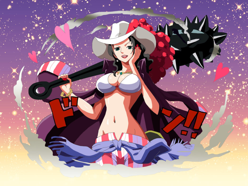 『ONE PIECE』に登場するアルビダは、白い広いつばの帽子をかぶり、紫のロングコートを羽織った造形が特徴的である。胸元を大きく開いた白いビキニトップに赤と白のストライプ柄のボトムスを合わせ、腰には青いリボン状の布を巻いている。手には大型の鉄棍を携え、背景には星光と花弁の装飾が散りばめられている。全体的に「戦闘服融合型」かつ「海賊衣装構造」に分類される。