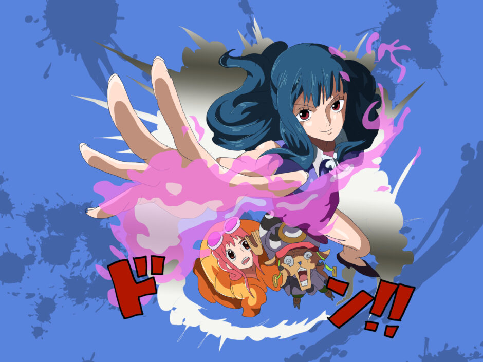 『ONE PIECE』に登場するアインは、濃紺の長髪とピンク色のエネルギー状エフェクトを纏った姿が特徴的である。衣装は上半身に白いトップス、下半身に青系のスカートを合わせ、手の動作に沿って流体的なエネルギーが展開している。髪は前髪が額にかかり、後部に向かって波打つ形状を持つ。全体として、視覚的には「能力発動型」および「制服融合構造」に分類される。