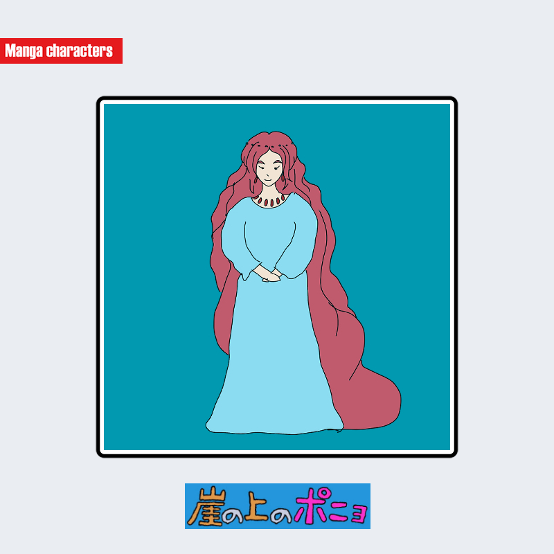 『崖の上のポニョ』に登場するグランマンマーレは、長く波打つ赤紫色の髪と、海のように流動的なフォルムを持つ女性的造形のキャラクターである。髪は肩から背面にかけて広がる大規模な曲線構造で、水流や光の反射を思わせる柔らかなラインを形成している。衣装は淡い水色のローブ風ドレスを基調とした「流体融合型」構造で、首元から胸部にかけて宝石状の装飾が点在している。全体として静的でありながらも動きを内包する形態設計が特徴的である。
