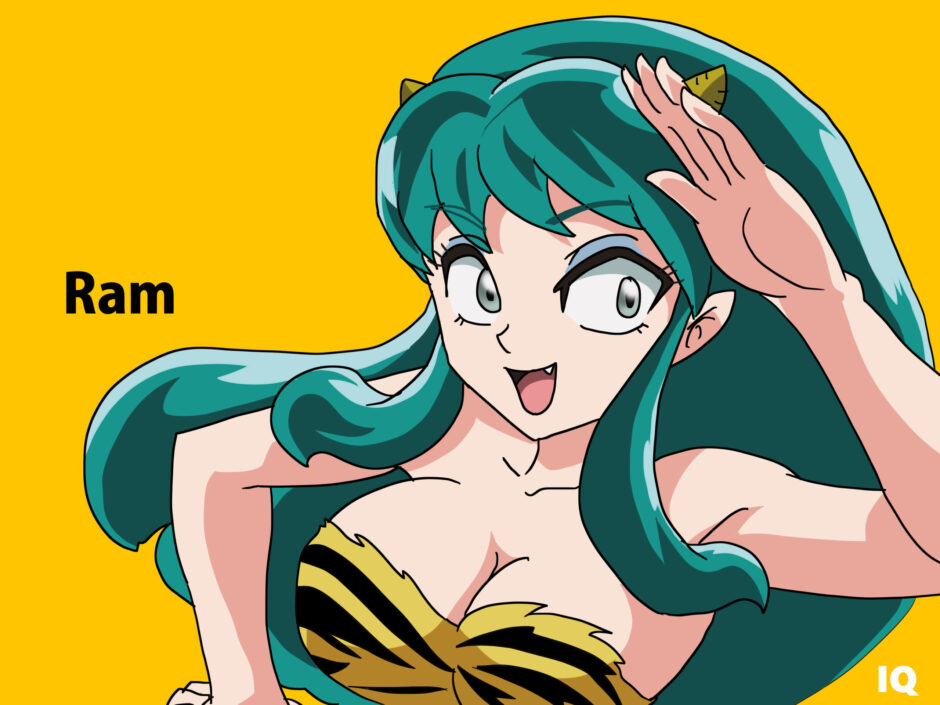 『うる星やつら』に登場するラムは、エメラルドグリーンの長髪とトラ柄の衣装を特徴とするキャラクターである。髪はふんわりと広がるストレート構造で、動きに合わせて波打つ柔軟な造形が見られる。衣装は黄色と黒のトラ柄ビキニを基調とした「擬人化コスチューム型」構造で、上半身の露出が多く、装飾を最小限に抑えたシルエットになっている。額には小さな角があり、非人間的要素を象徴的に示す造形バランスを持つ。
