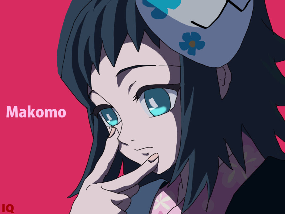 「Makomo」は他言語圏では植物名「Zizania latifolia(真菰)」と混同されることがあるため、固有名詞であることを示すために「Makomo (character from Demon Slayer)」と明示するのが望ましい。髪飾りの記述には「floral-patterned hair ornament」や「blue-and-white fabric accessory」が適しており、文化的な意味を含まず構造的要素を中心に訳すと良い。