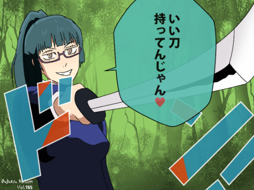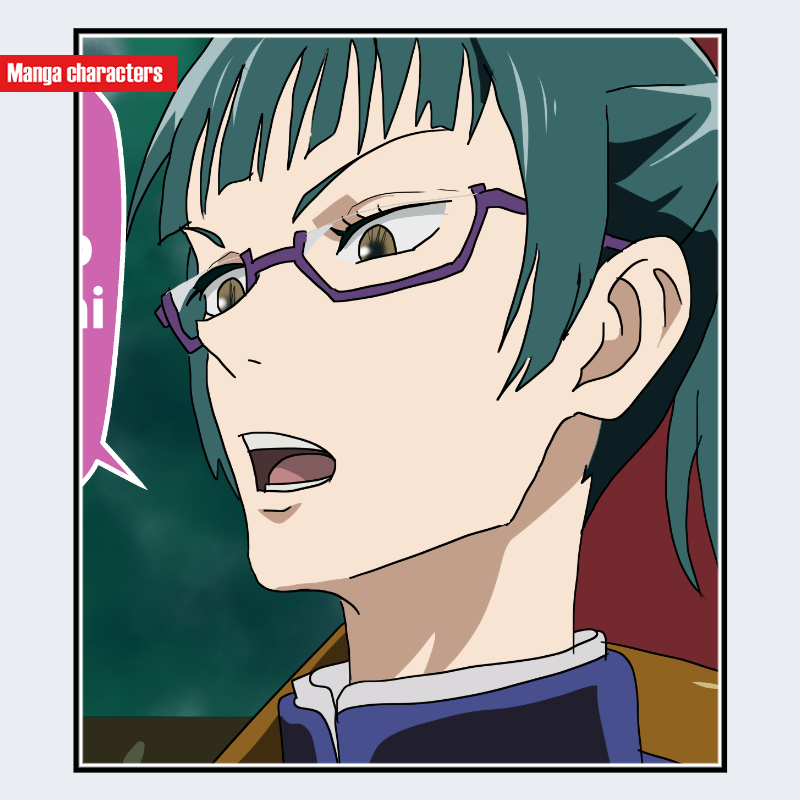 『呪術廻戦』に登場する禪院真希(ぜんいん まき)は、深緑色の髪を後方でまとめた「高位置ポニーテール構造」のキャラクターである。前髪は眉上で分けられ、左右に自然な段差を持たせている。衣装は紺色の上衣に立ち襟を備えた「制服融合型」構造で、袖口や襟元に白のラインが施されている。視認情報上、紫系のスクエア眼鏡を着用しており、知的印象を与える要素として機能。上半身のデザインは動作性と防護性を両立させた直線裁縫が特徴である。