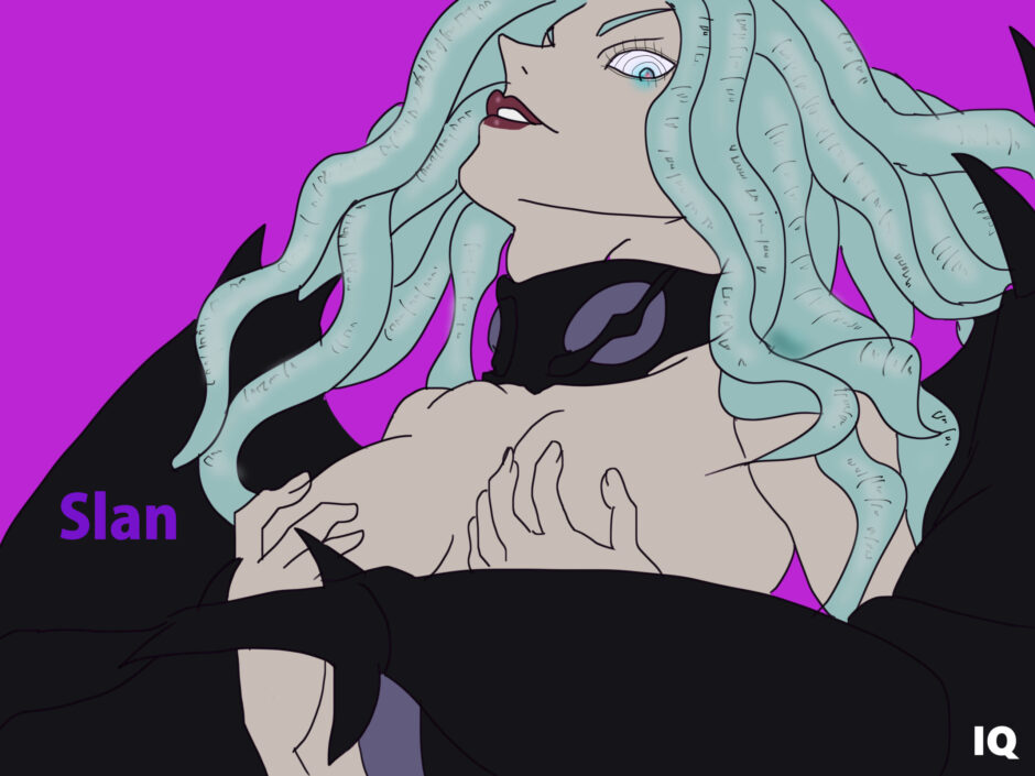 『ベルセルク』に登場するスランは、淡い緑青色の髪と闇を纏うような黒の衣装を持つ女性キャラクターである。髪は波打つ蛇状の束構造を形成し、動的で有機的な形状が特徴的である。衣装は金属質と皮膜的質感を併せ持ち、胸部から腰部にかけて露出度の高い「異形融合型」構造に分類される。肩部から広がる黒翼状のパーツが全体のシルエットを支配し、肉体と闇が融合したような造形を際立たせている。