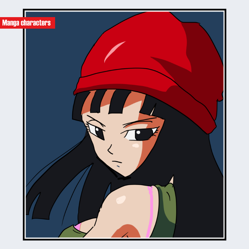 『ドラゴンボール』に登場するマイは、黒髪のロングストレートと特徴的な軍服風衣装を持つ女性キャラクターである。髪は前髪を短く整えた直線的な構造で、全体は腰まで伸びるロングスタイル。衣装は深緑色の戦闘服に茶色のベルトを組み合わせた「軍装融合型」構造で、腕章には赤いシンボルマークが施されている。また、赤いベレー帽が視覚的なアクセントとして機能しており、全体に統一感のある軍事的デザインが際立っている。