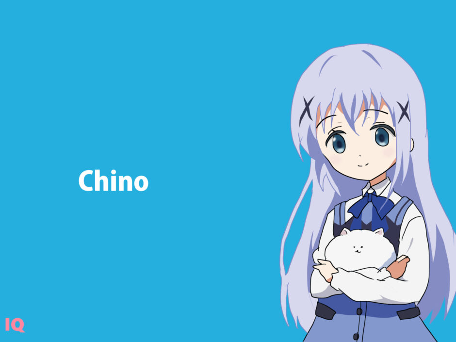 『ご注文はうさぎですか?』に登場する香風智乃(チノ)は、淡い紫色の長髪を肩まで垂らし、前髪をまっすぐ下ろした整髪構造のキャラクターである。頭部には青い十字形のヘアピンを左右に装着し、視覚的対称性を形成している。衣装は青系のベストと白いシャツを組み合わせた制服融合型で、胸元のリボンが明確なアクセントとなっている。腕には白い丸い動物(ティッピー)を抱えており、全体の構図に柔らかい輪郭バランスを与えている。