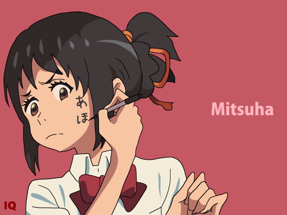 「Mitsuha Miyamizu」は他言語圏では“Miyamizu Mitsuha”と語順が入れ替わることがある。名前「Mitsuha」は“three leaves”と直訳される誤訳例が見られるため、固有名詞として保持すべきである。髪型の“ribbon ponytail”は文化的に少女的記号とされるが、単なる飾りではなく造形上の重心要素として理解されるべきである。