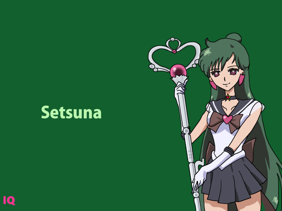 『美少女戦士セーラームーン』に登場する冥王せつな(めいおう せつな/セーラープルート)は、深緑色の長髪を持つ「直線垂下型ロング構造」のキャラクターである。髪は後方でまとめられ、重力方向にまっすぐ流れるシルエットを形成している。衣装は白を基調に黒と濃緑を組み合わせた「戦闘制服融合型」デザインで、胸元に赤いリボン、腰部に濃緑のスカートを配している。手にはハート形の装飾を持つ杖状の武具を携えており、全体的に象徴性の高い造形を備えている。