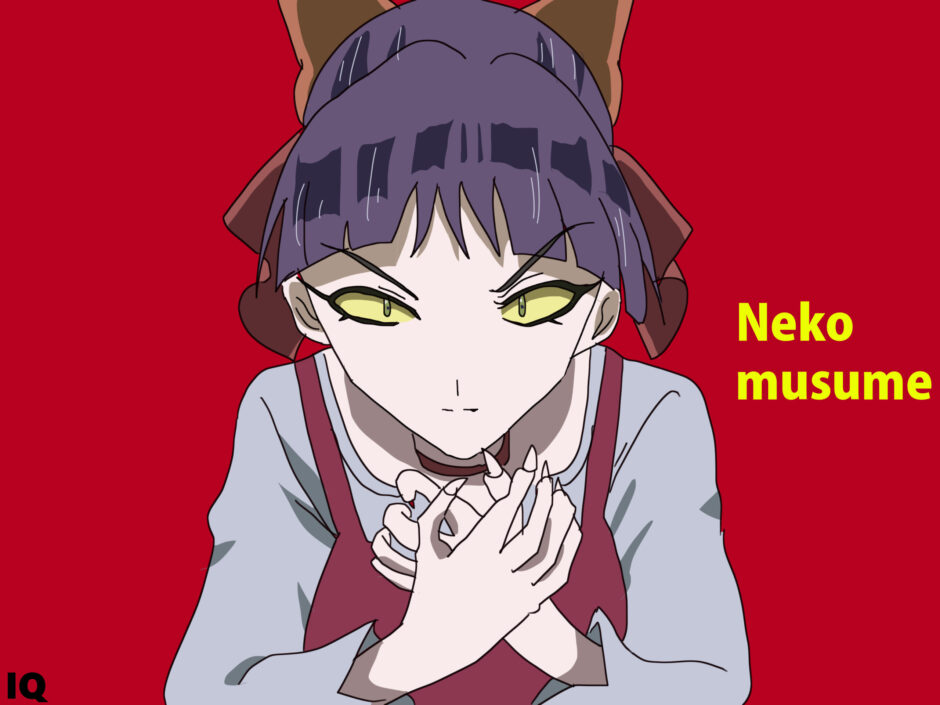 『ゲゲゲの鬼太郎』に登場する猫娘(ねこむすめ)は、猫的要素を人間の外見に融合させた擬獣化構造のキャラクターである。紫がかった髪を高めの位置で結い、両側に鋭く伸びる束が耳状に見える造形をしている。瞳は黄色に輝き、猫のような縦長の瞳孔を持つ。衣装は赤いワンピースに白のインナーを重ねた簡素な構成で、動きやすさを重視した形状となっている。全体として、人型のフォルムに獣的記号を組み込んだハイブリッドデザインが特徴である。
