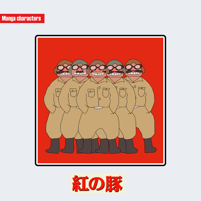 『紅の豚』に登場するマンマユート団は、複数の人物が同一の飛行服を着用した集団的構造を持つキャラクター群である。全員がベージュ系のフライトスーツを着ており、頭にはゴーグル付きの飛行帽を装着している。顔面には特徴的な大きなサングラス状のゴーグルが統一的に描かれ、赤みを帯びたレンズが印象的である。手袋とブーツは濃色で統一され、全体的に量産的・機能的な構成をとる。構造分類としては「集団制服型」に該当する。