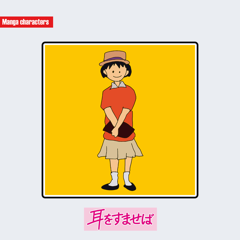 『耳をすませば』に登場する月島雫は、短く整えられた黒髪と丸みを帯びた帽子を身につけた姿が特徴的である。衣装は赤系の半袖トップスにベージュのプリーツスカートを組み合わせ、足元は白い靴下と黒い靴で構成されている。全体に明快な色の対比が見られ、制服ではなく私服としての自由度が高い構造である。小脇に濃色の本を抱えており、日常的動作を意識した自然なデザインとなっている。構造分類としては「日常服融合型」に該当する。