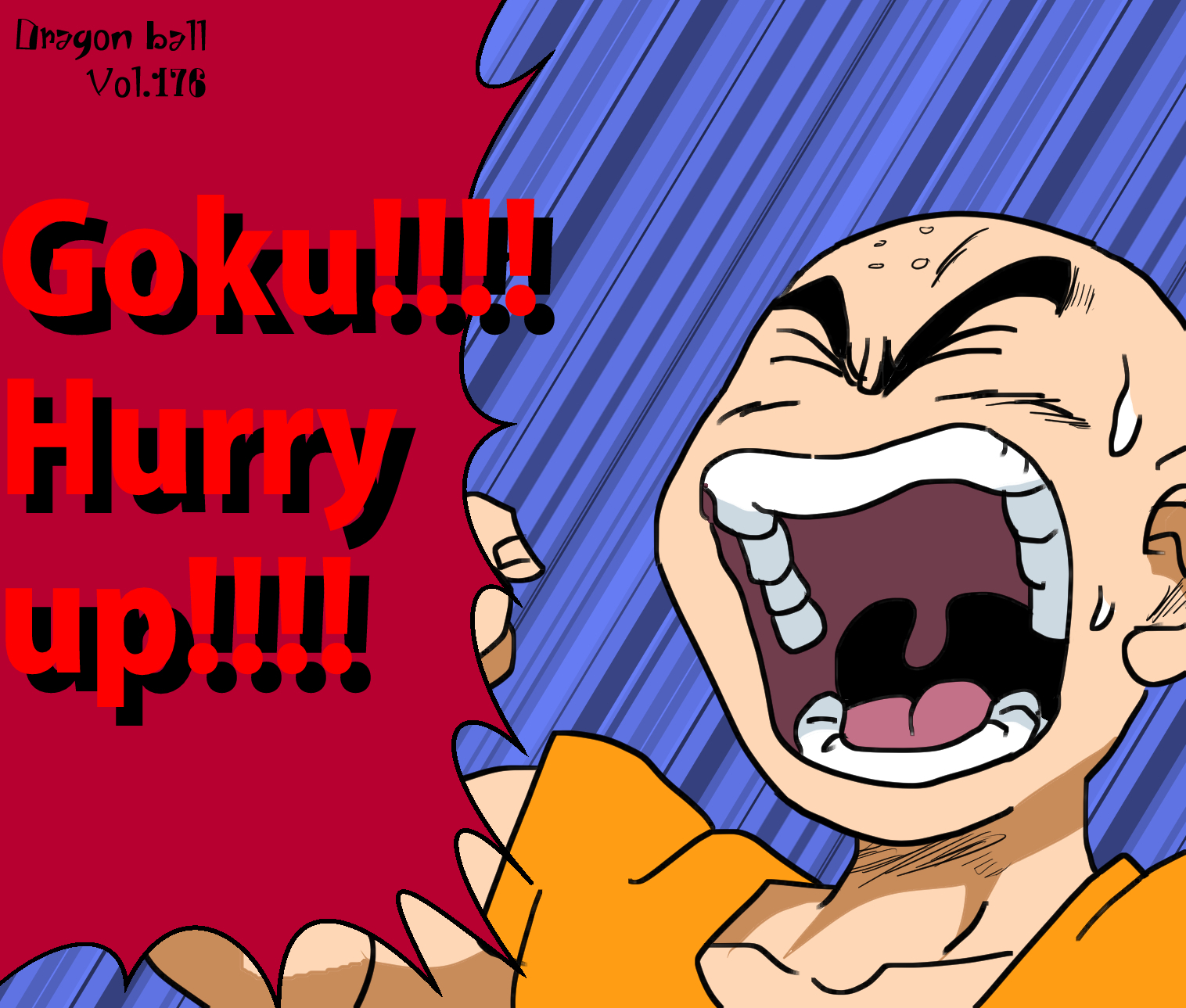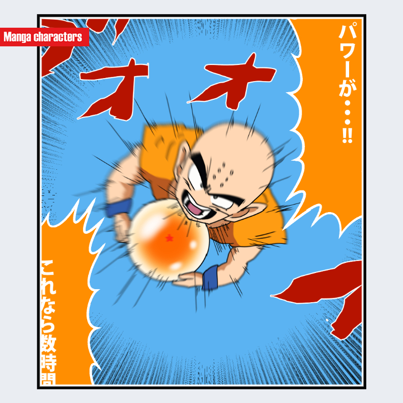 『ドラゴンボール』に登場するクリリンは、丸みのある頭部に特徴的な点状の痕が配置された外見を持つ。画像では上半身が視認でき、道着は橙色主体で肩幅が広く、袖の短い武道着構造である。腕周りは筋肉線が強調され、体格は小柄ながら引き締まった造形。手前には球体状のエネルギー演出が描かれているが、視認情報としては掌を前に突き出す姿勢が確認できる。同作の他キャラと比較すると、頭部のシルエットがすぐに識別可能な「簡略化頭部造形型」に属する。