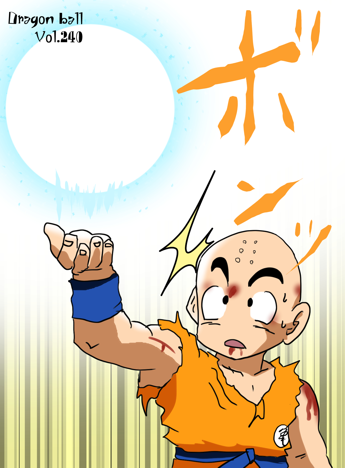 頭部の点状痕は“dots” や “marks” など直訳すると意味が変わる可能性があり、文化的背景を知らない読者は誤読しやすい点に注意する。橙色の道着は “orange martial-arts uniform” と補足的に記述すると意図が伝わりやすい。エネルギー球の描写は比喩的に理解されることが多いため、構造物として扱わず視覚要素として説明するのが適切。