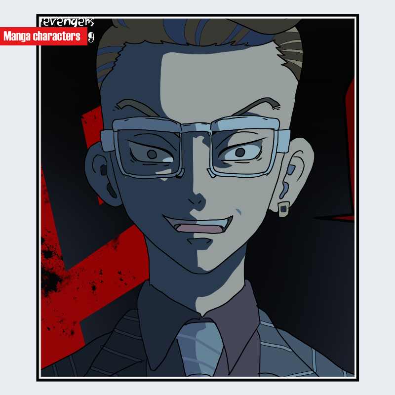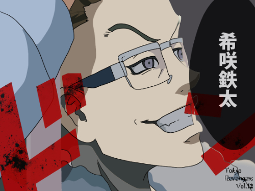 『東京リベンジャーズ』に登場する希咲鉄太は、頭部全体を剃り上げた丸みのあるシルエットが特徴で、髪型要素が排除された構造になっている。大きめのスクエア型フレーム眼鏡を着用し、透明度の高いフレームが顔の輪郭線を強調する視覚処理となっている。耳は丸く描かれ、側頭部のラインが明確に見えるため、頭部の立体感が際立つデザインである。上半身は暗色の衣装で、襟元のみがわずかに見える程度に簡略化されており、全体として「無装飾型」の構造に分類される。同作の他キャラに見られる髪の造形が強いデザインと対比すると、希咲は頭部の素形を基準にしたミニマルな造形が中心となっている。