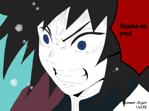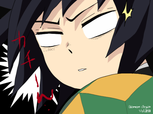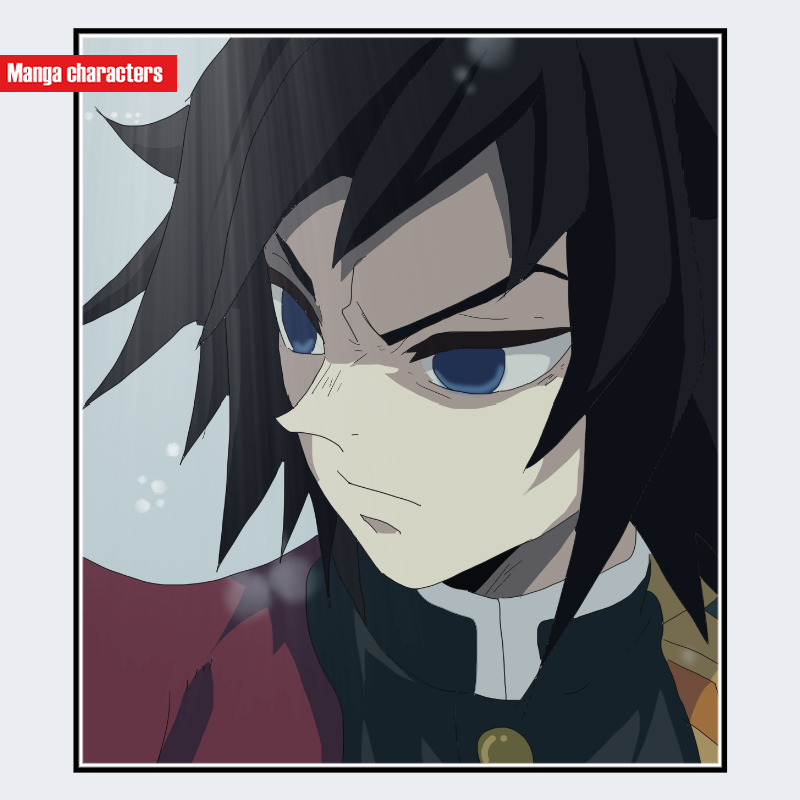 『鬼滅の刃』に登場する冨岡義勇は、黒に近い濃紺の長めの髪を持ち、前髪が大きく割れて額へ落ちる束状のシルエットが特徴である。側頭部から後方へ向かう髪束は直線的で、動きのある方向性を強調した描線が用いられている。瞳は青系で深みのある色彩が設定され、目元のシャープな線と強い陰影処理が顔の輪郭を引き締めている。衣装は濃緑の隊服と羽織が視認でき、羽織の片側だけが柄入りという左右差のある構造が特徴的で、「衣装主体型」に分類できる。同作の他キャラよりも衣装の配色パターンが複雑で、視覚情報が上半身に集中している。