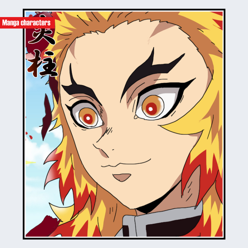 『鬼滅の刃』に登場する煉獄杏寿郎は、鮮やかな金髪を基調に、毛先へ向かって赤く燃え上がるような配色が施された髪型が特徴である。髪束は大きく外側へ広がり、炎の形状を思わせる鋭いシルエットが形成されている。太く長い眉は黒色で、目は赤みの強い虹彩を持ち、瞳孔が縦長に描かれた独特の構造が視認できる。上半身は鬼殺隊の隊服を基盤に白い羽織を羽織り、羽織の裾には炎の模様が入る「衣装主体型」のデザインとなっている。同作の他キャラクターと比較しても、髪色と羽織模様の双方が強い要素を持ち、視覚的中心点が明確に設定されている。