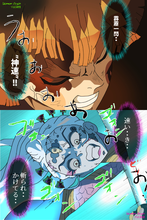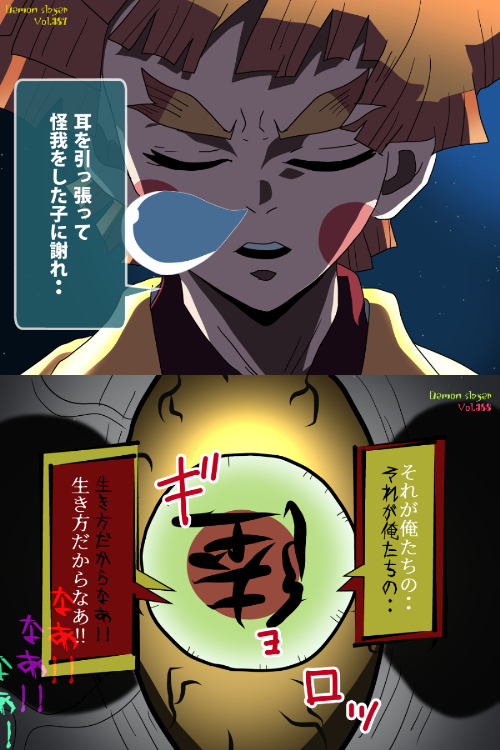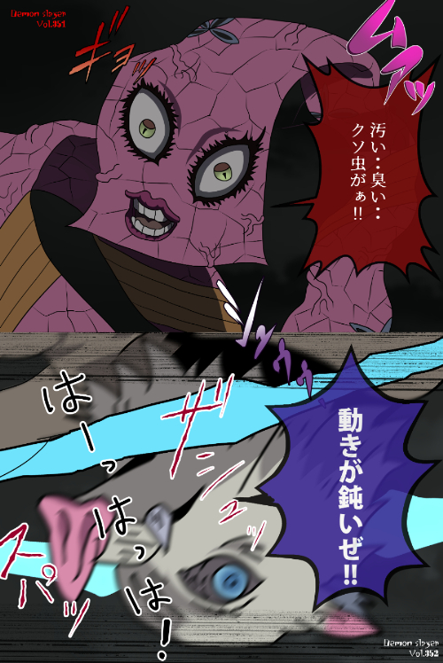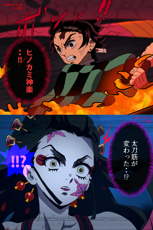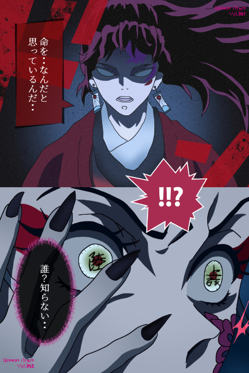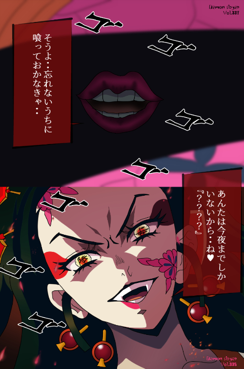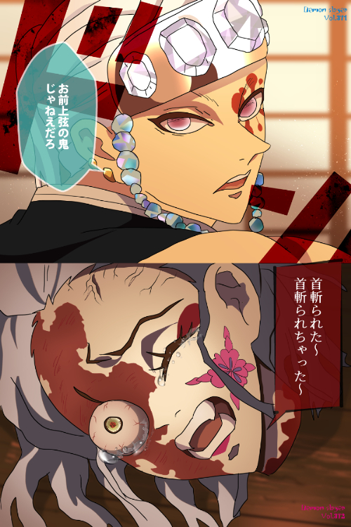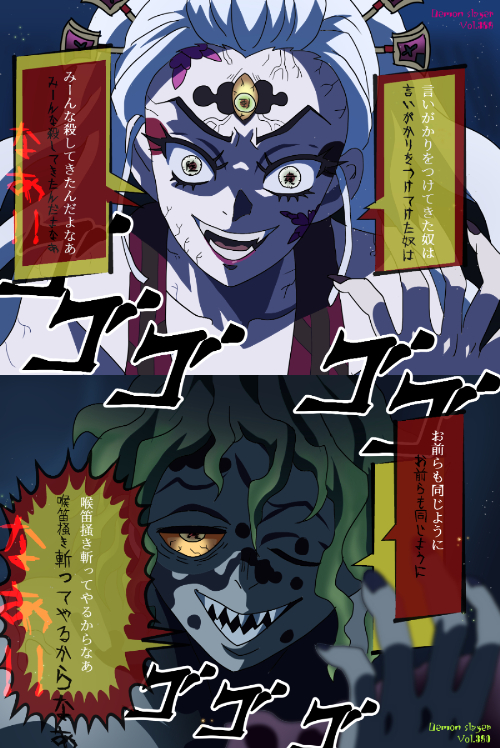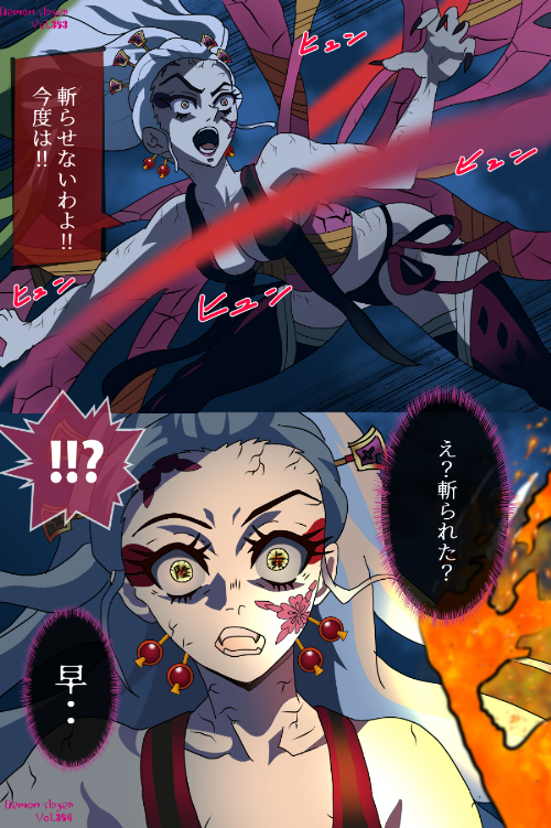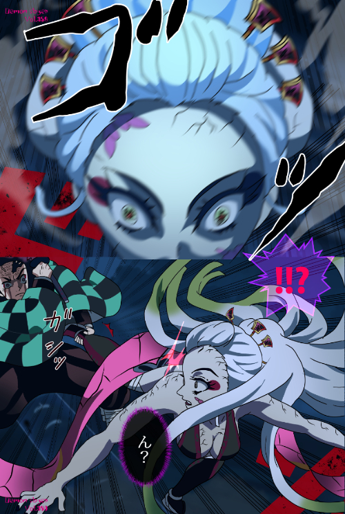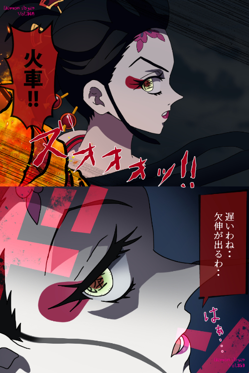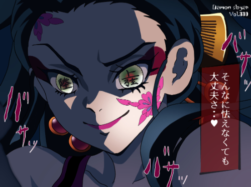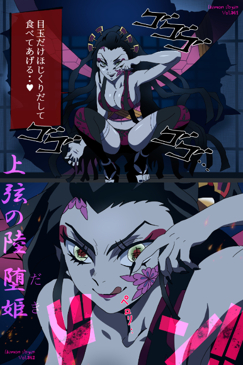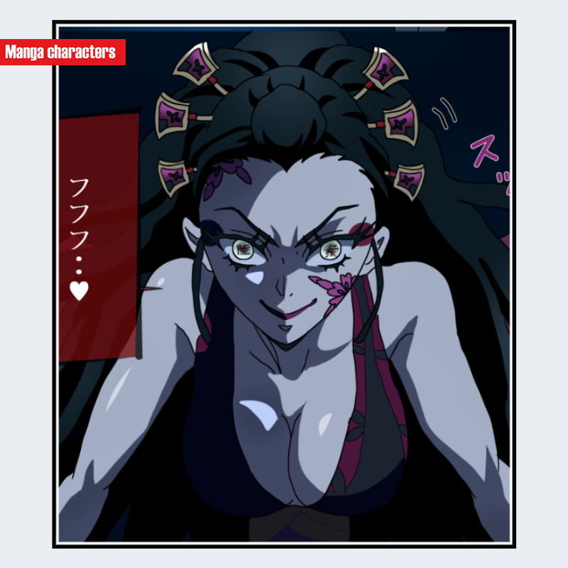 『鬼滅の刃』に登場する堕姫は、長く流れる黒髪を高い位置で束ね、前方へ向かう髪束が鋭く分岐する特徴的なシルエットを持つ。頭部から顔にかけては赤紫系の帯状模様が複数入り、左右非対称に配置された文様が造形上の識別点となっている。瞳は緑を基調にした強い彩度の色彩で、虹彩外周が太く描かれ視線の印象を際立たせる構造である。衣装は肩や胸元が大きく露出し、細い布帯が身体に沿って配置される造形で、「装飾強調型」に分類できる。同作の鬼舞辻無惨などと比較すると、頭部・顔・衣装の三要素に均等に高密度の視覚情報が配置されている点が際立つ。