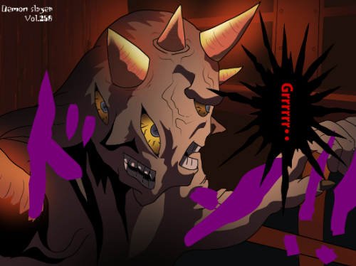 『鬼滅の刃』に登場する本画像の鬼は、尖った複数の角を額から生やした頭部造形を持ち、表皮は茶色系で凹凸の多い質感に描かれている。瞳は黄色を基調としており、黒い縦長の瞳孔が強い対比を生み、視線の迫力を際立たせる構造となっている。口元には鋭い牙が並び、上下に大きく裂けた口の形状が確認できる。上半身は筋肉質で、衣装の情報はほぼなく露出が多いため、身体そのものの造形が視覚的中心となる「擬獣化構造」に分類できる。『鬼滅の刃』の他の鬼と比較しても、角の配置と目の黄色い色面が識別性の高い要素となっている。