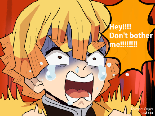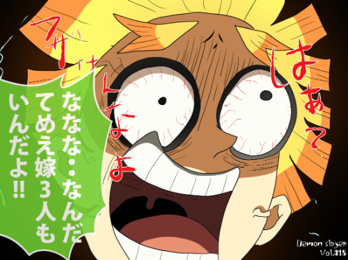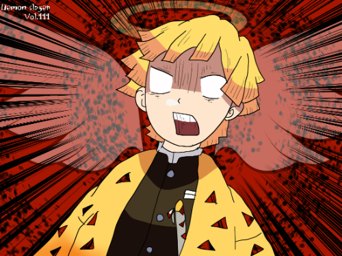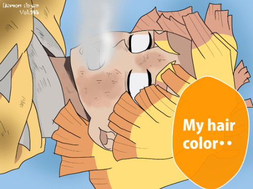 橙色短髪のキャラクターは他作品にも存在するが、均等に整えられた三角形状の髪先と放射状に広がる描線の組み合わせを併記することで、本作の善逸との混同を防ぎやすい。