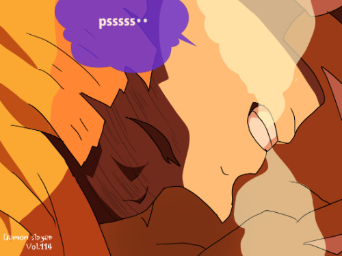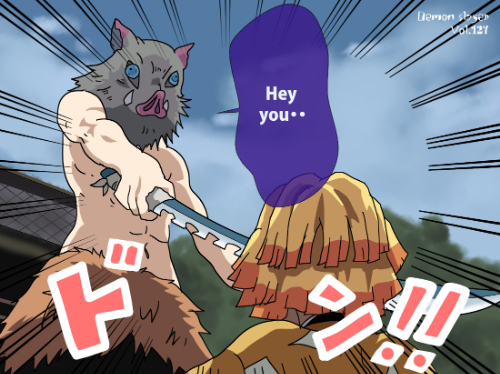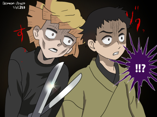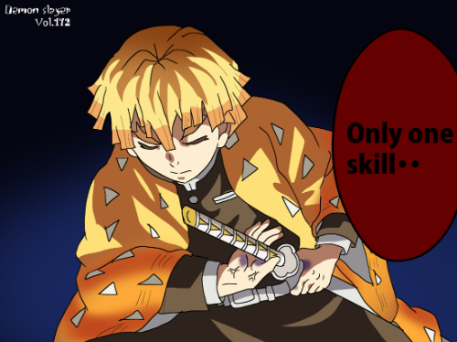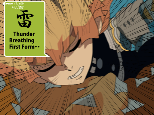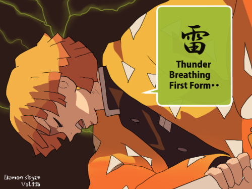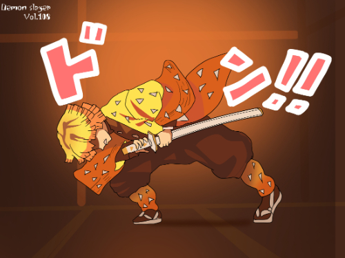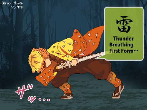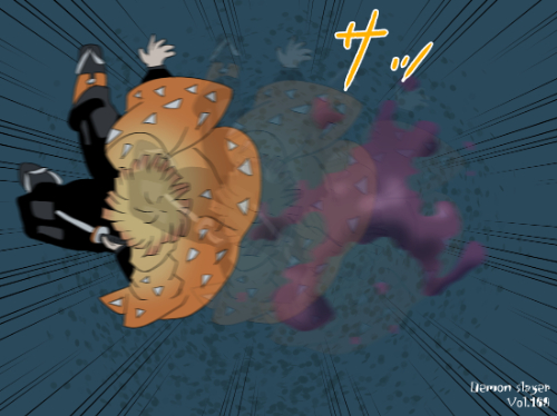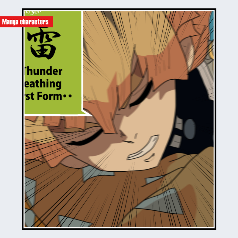 『鬼滅の刃』に登場する我妻善逸は、明るい橙色を基調とした短い髪型で、髪先が均等にカットされた三角形状のシルエットが特徴である。前髪は額に沿って段差状に整えられ、動きのある線が強調されている。上半身は隊服の濃色衣装に加え、羽織の一部が見える構成となっており、衣装の色面パターンよりも髪型の存在感が強い「髪形主体型」に分類できる。姿勢は前傾で、髪が動きに合わせて放射状に広がる描線が確認できる。同作の嘴平伊之助の獣頭シルエットとは対照的に、幾何学的な髪先の形状が識別点となる。