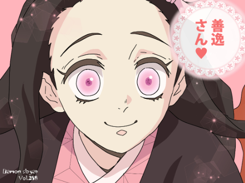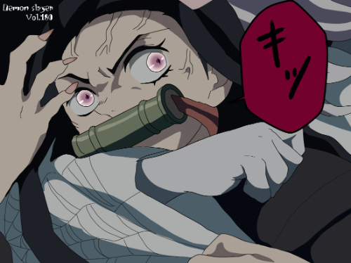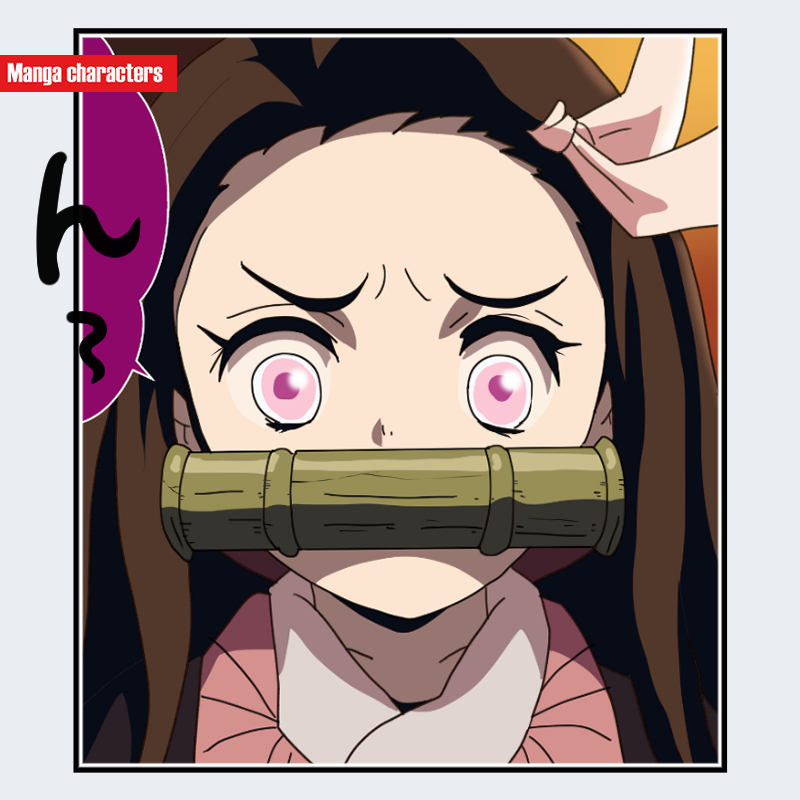 『鬼滅の刃』に登場する竈門禰豆子は、淡い桃色の瞳と大きく丸みを帯びた虹彩が特徴で、外周の濃い線が目の存在感を強調している。口元には竹筒を固定する構造があり、紐で頭部後方へ留められた特有の装飾要素が視認できる。髪は黒を基調に、先端へ向かって緩く赤味を帯びる長髪で、頭部右側に小型のリボン状装飾が付く非対称構造となっている。上半身は着物の襟元が見え、淡い色の内層と濃い外層の色面が重なる「衣装主体型」に分類できる。同作の他キャラと比べても、口元の竹筒と桃色の瞳という二点が最も識別性の高い視覚記号となっている。