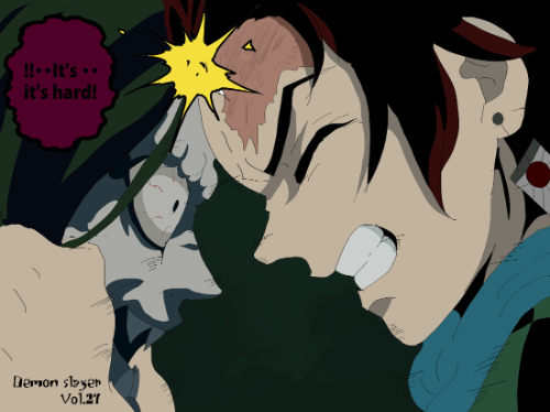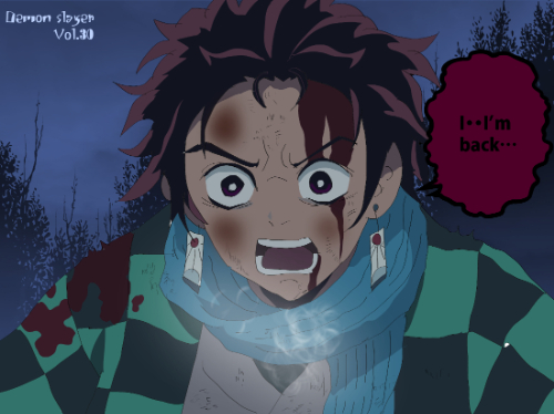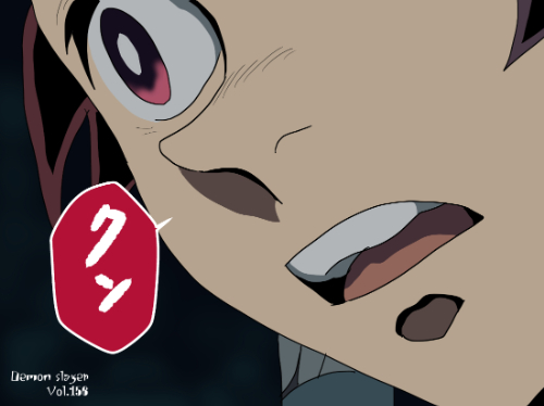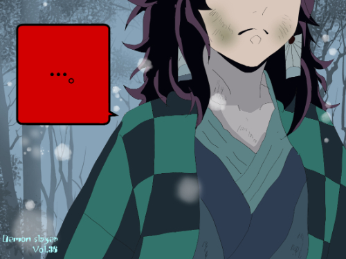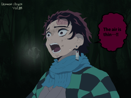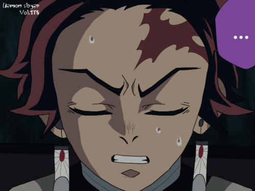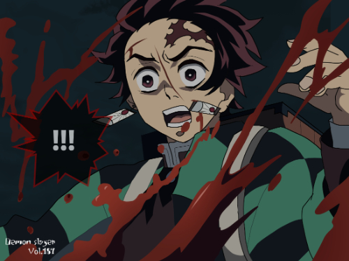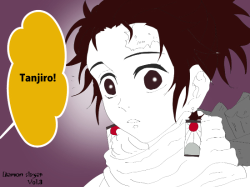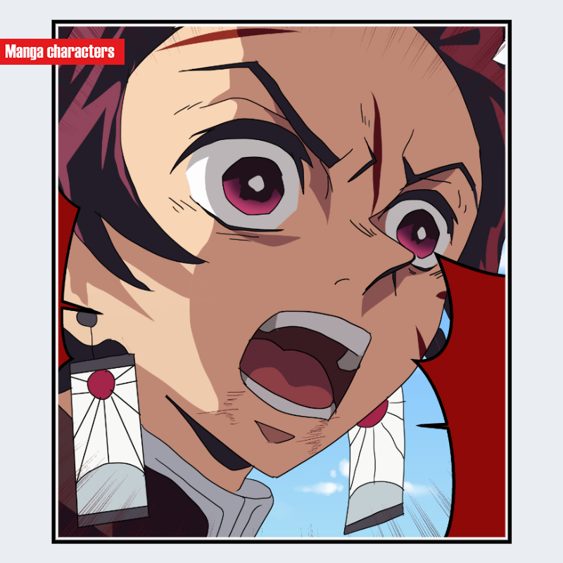 『鬼滅の刃』に登場する竈門炭治郎は、赤みを帯びた黒髪を短く整え、髪束が外側へ向かって不規則に跳ねるシルエットを持つ。額には傷状の模様が確認でき、視覚的な中心点として機能している。瞳は赤紫系で、虹彩の外周が濃く描かれた構造により、目元の印象が強調されている。上半身の可視範囲では緑と黒の市松模様の羽織が見え、隊服の濃色と対比する「衣装主体型」の構造が特徴である。同作の善逸や伊之助と比べ、衣装の模様性と額の傷模様という二点が特に強い識別要素となっている。