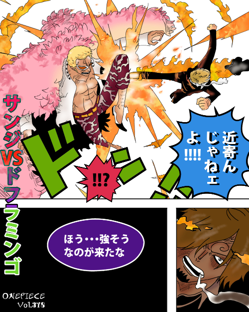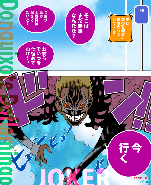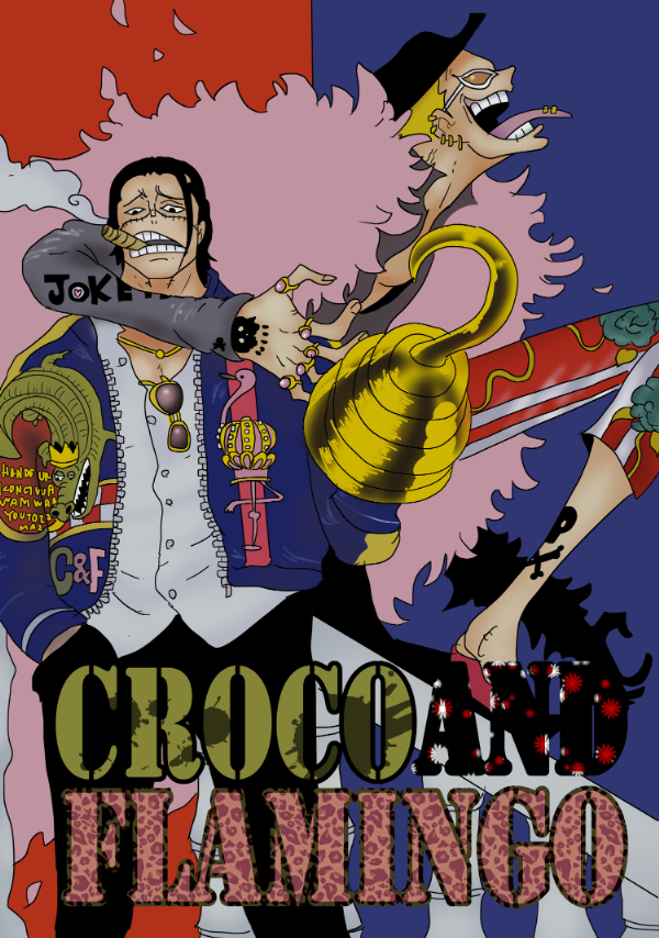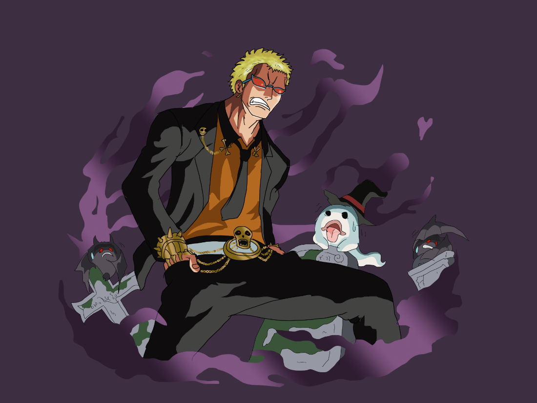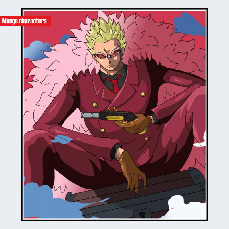 『ONE PIECE』に登場するドフラミンゴは、鮮やかな金髪を短く立ち上げた髪型と、縁が太いサングラスを常時着用する頭部構造が特徴である。上半身は濃いピンク系のスーツを基調とし、インナーやネクタイも同系色で統一された配色構造となっている。背面には羽毛のように大きく広がる淡いピンク色のコートが確認でき、全体のシルエットに強い存在感を与えている。体格は細身だが手足が長く、スーツの直線的なラインが脚部を強調する「衣装主体型」の造形といえる。同作のくまのような丸みの大柄体型とは異なり、縦長シルエットと装飾性の高いコートが視覚的中心となっている。