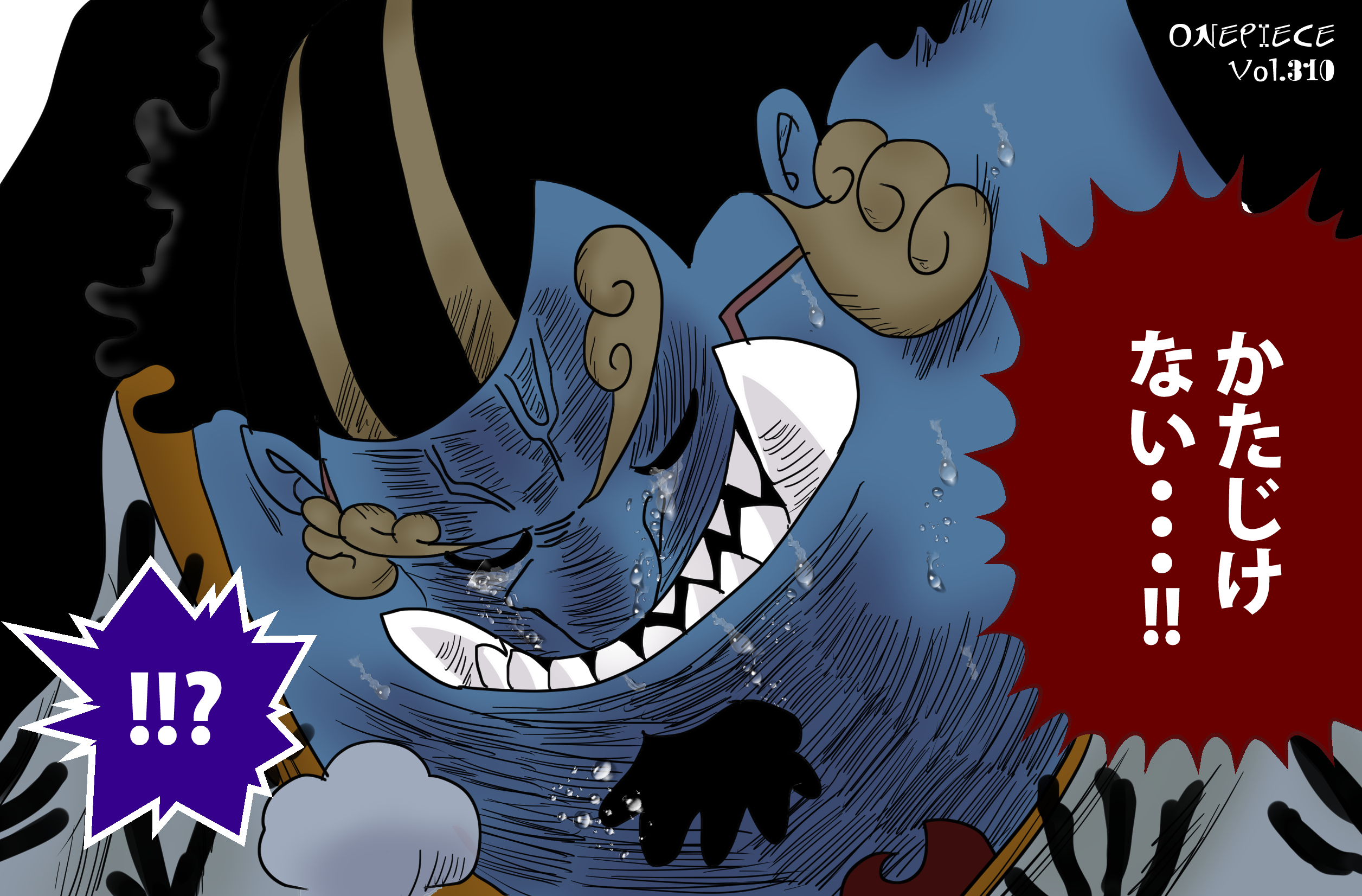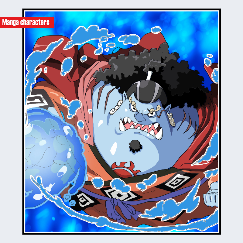 『ONE PIECE』に登場するジンベエは、青い肌と大きな体格を特徴とし、頭部には黒い縮れた髪がまとまり、額部分に帯状の飾りが巻かれている。眉は太く鋭い角度で描かれ、目は黄色系の虹彩と黒い瞳孔の対比によって視線の強さが際立つ構造を持つ。上半身には赤い羽織が確認でき、黒と白の模様が部分的に配置された「衣装主体型」の視覚構造となっている。体格は横幅の広いシルエットで、肩から胸元にかけての大きな面積が造形の主軸となる。同作のドフラミンゴの縦長シルエットとは異なり、ジンベエは横方向に重心を置いた造形が特徴的である。