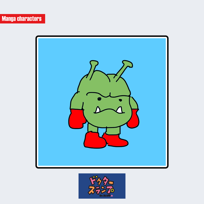 『Dr.スランプ アラレちゃん』に登場するニコチャン大王は、丸く膨らんだ胴体と短い四肢で構成されたデフォルメ体型が特徴である。頭部上方には2本の触角状パーツが伸び、輪郭全体は緑色で統一されている。口元には左右に尖る牙があり、表情の構造に強い記号性を与えている。手足は赤い手袋と赤い靴で覆われ、体色との明確な色対比が視覚的焦点となる。「擬獣化構造」に分類され、同作の人型キャラクター群とは異なる階層のデザインを持つ。
