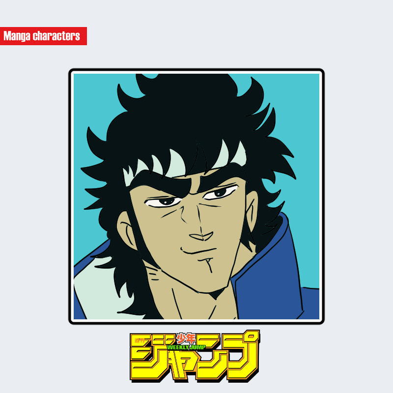 『魁!!男塾』に登場する剣桃太郎は、逆立つように外側へ広がる黒髪と太く角度のついた眉を特徴とする擬人化構造のキャラクターである。髪型は後方へ向かって大きく跳ね上がる束状のシルエットで、額には短い前髪が数本垂れる構造になっている。顔は頬骨の張りと直線的な輪郭線が特徴で、目は細めで鋭さが強調されている。上半身は青系の衣装で、襟元が高めに立ち上がるデザインとなっており、髪型の外向き構造と調和している。視覚的には、髪の外角と眉の太さが造形上の主要要素となっている。