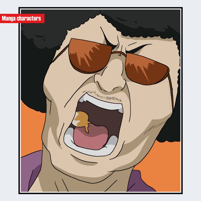 『銀魂』に登場する井上勝水は、口元を大きく開けた瞬間が描かれており、丸みのある輪郭と濃い肌色が視認できる。特徴的な要素として、レンズが大きく濃色のサングラスを着用し、鼻下には短く均一な口ひげが確認できる。髪は暗色で全体的にボリュームがあり、アフロ状の丸いシルエットを形成している。衣装の大部分は画角外だが、首元に淡色の衣類が見え、一般的な日常服に分類される。構造分類としては「装飾融合型」「特徴強調型」に該当する。