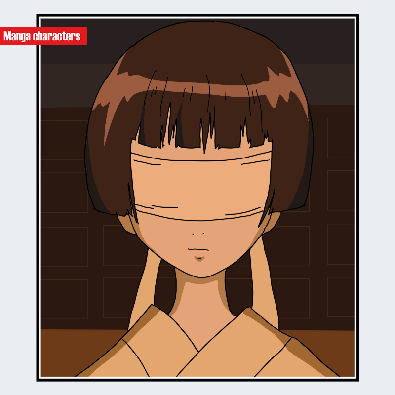 『銀魂』に登場する阿国(おくに)は、前髪から頬にかけて布のような帯状の構造物で顔面上部を覆っており、目元・鼻梁が完全に隠された特徴的な遮蔽構造を持つ。髪型は丸みを帯びたおかっぱ型で、均一に整った形状が確認できる。露出している下顔面は細く、口元は小さく簡略化されている。衣装は淡色の和装で、襟元が広めに重なり、布のレイヤーが直線的に配置されている。全体として「遮蔽型」「和装融合型」の構造分類に該当する。