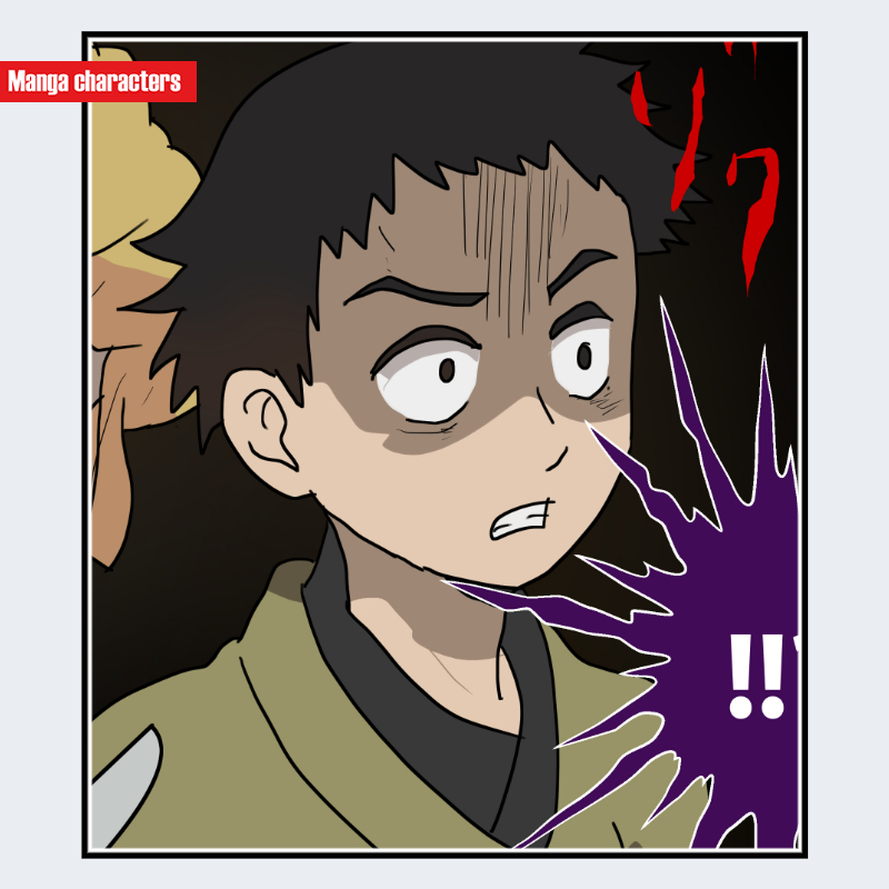 『鬼滅の刃』に登場する「短髪の少年」は、黒色の短髪を不規則にカットした形状で、前髪が不揃いに落ちる素朴なヘアスタイルを持つ。輪郭は丸みがあり、体格も華奢で、子供特有の小柄なシルエットが確認できる。衣装は淡い緑系の和装で、内側に濃色の襟が見える二層構造になっている。背後には別キャラのシルエットが一部重なっているが、本体の衣装要素とは無関係である。全体として、装飾がほとんどなく、最低限の線で構成された「簡素化デザイン型」に分類される。