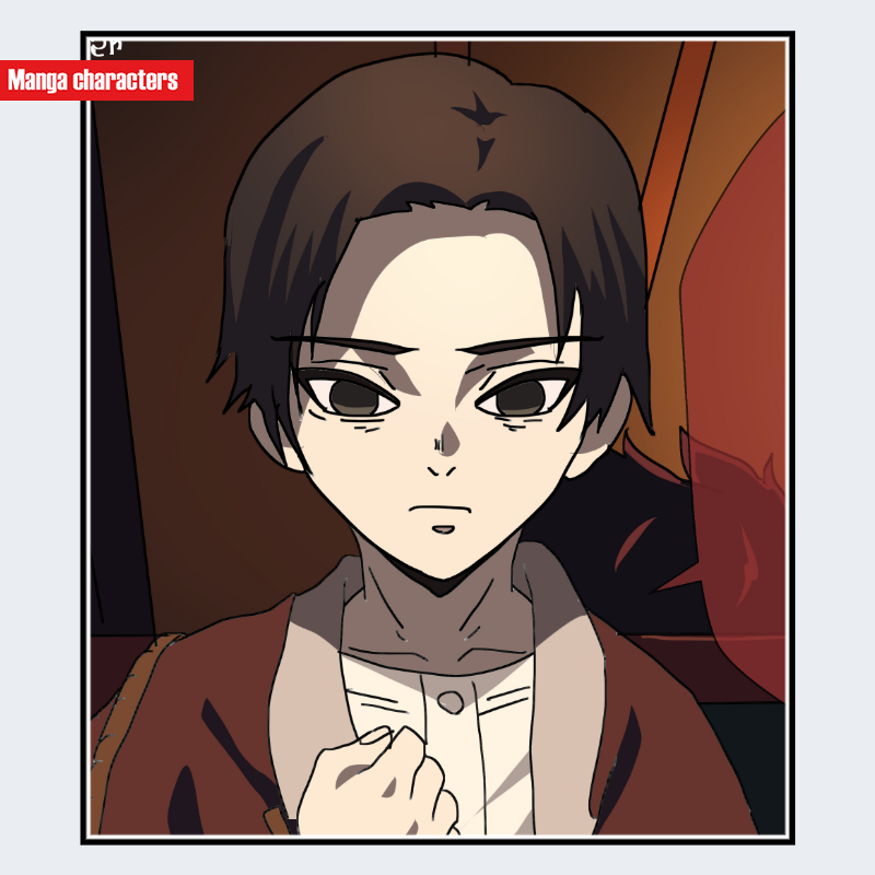 『鬼滅の刃』に登場する「結核の青年」は、中央分け気味の短めの黒髪を持ち、額部分が広く露出する整ったシルエットが特徴である。目元は細い線で描かれ、上下のまつげを強調した構造が見られ、輪郭は細身にまとめられている。衣装は淡色の襟を備えた和装系インナーと、上に羽織る茶系の外衣の二層構造で、素材感よりも輪郭線の簡略化を重視した描写となっている。全体として、余計な装飾を持たず、清潔感のある「簡素化デザイン型」の造形が基調である。