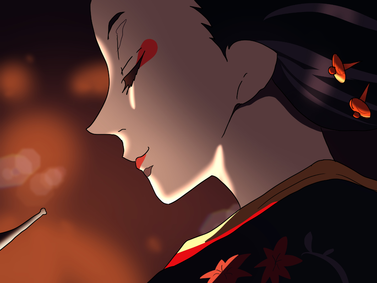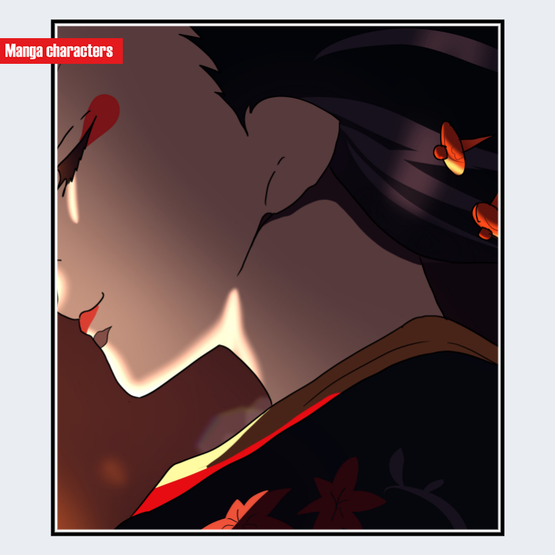 『鬼滅の刃』に登場するときと屋の子供は、伝統的な子供用の舞妓風髪型にまとめられた黒髪が特徴であり、髪飾りとして赤系の花モチーフが複数配置されている。顔立ちは丸みを帯び、白粉を思わせる明るい肌色で統一され、眉や目元の線は細く描かれている。衣装は鮮やかな橙色の和装で、襟元と袖口に淡色の差し色が入り、子供向けの簡易的な仕立てが確認できる。全体として「和装児童型」の構造を持ち、成人舞妓の複雑な装飾構造と比べて、髪飾りの密度と衣装の線数が抑えられている。