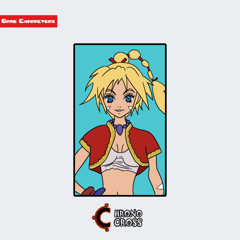 『クロノ・クロス(1999年)』に登場するキッドは、金色の髪を高く束ねたポニーテールと編み込みを組み合わせた髪型を特徴としている。首元には紫色の宝石のペンダントを下げ、胸部を露出させた白い短いトップスを着用している。肩には赤い半袖のショートジャケットを羽織り、金の縁取りが施されている。腕には茶色のグローブを着け、腹部や腕の素肌が露出する構造となっている。これらは「冒険装束型」「装飾融合構造」といった分類に該当する。他キャラの重装飾的な衣装と比較すると、軽装かつ実用性を意識した造形が際立つ。