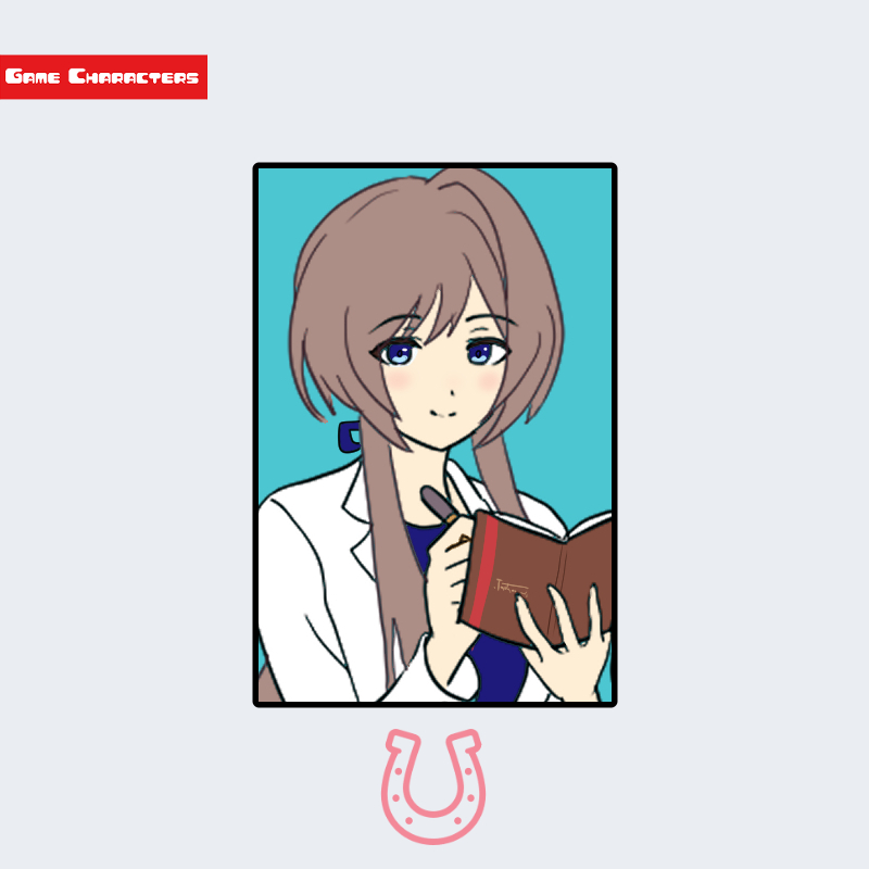 『ウマ娘 プリティーダービー(2018年)』に登場する乙名史悦子は、落ち着いた茶色の髪を肩まで伸ばし、顔周りに軽く流れる毛先を整えた髪型を持つ。瞳は青紫色で、耳飾りを付けているのが確認できる。衣装は濃紺のインナーに白衣を羽織る形となっており、手には赤い表紙の手帳を持っている。装飾はシンプルで、全体として研究者・指導者的な雰囲気を示す服装構成である。これらは「研究職風型」「現代融合構造」に分類できる。他の制服を基調とするキャラと異なり、現代的な衣装をまとった特徴が際立つ。