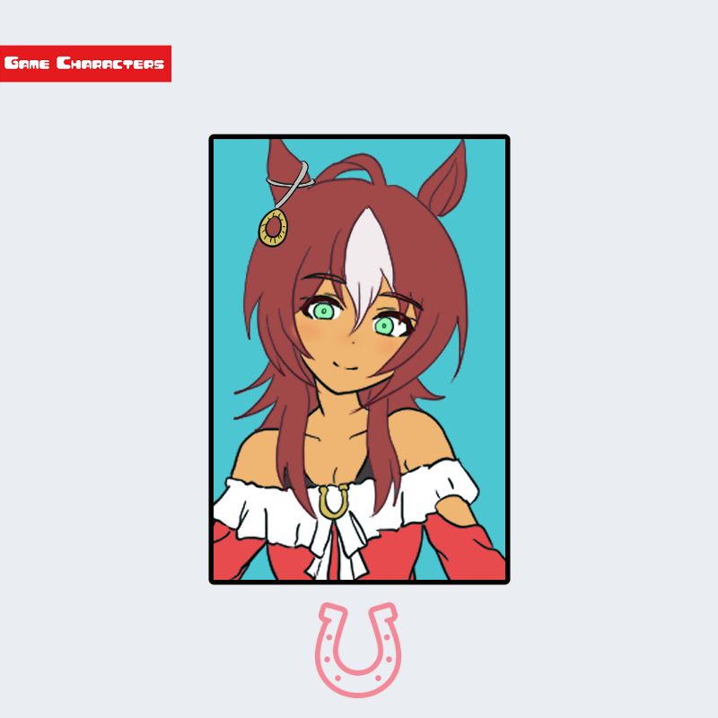 史実の馬名と完全に一致するため、競馬史の文脈と混同されるリスクが非常に高い。本キャラは赤髪・白前髪の毛束・オフショルダー衣装を備えた「ウマ娘」のキャラクターである点を強調する必要がある。